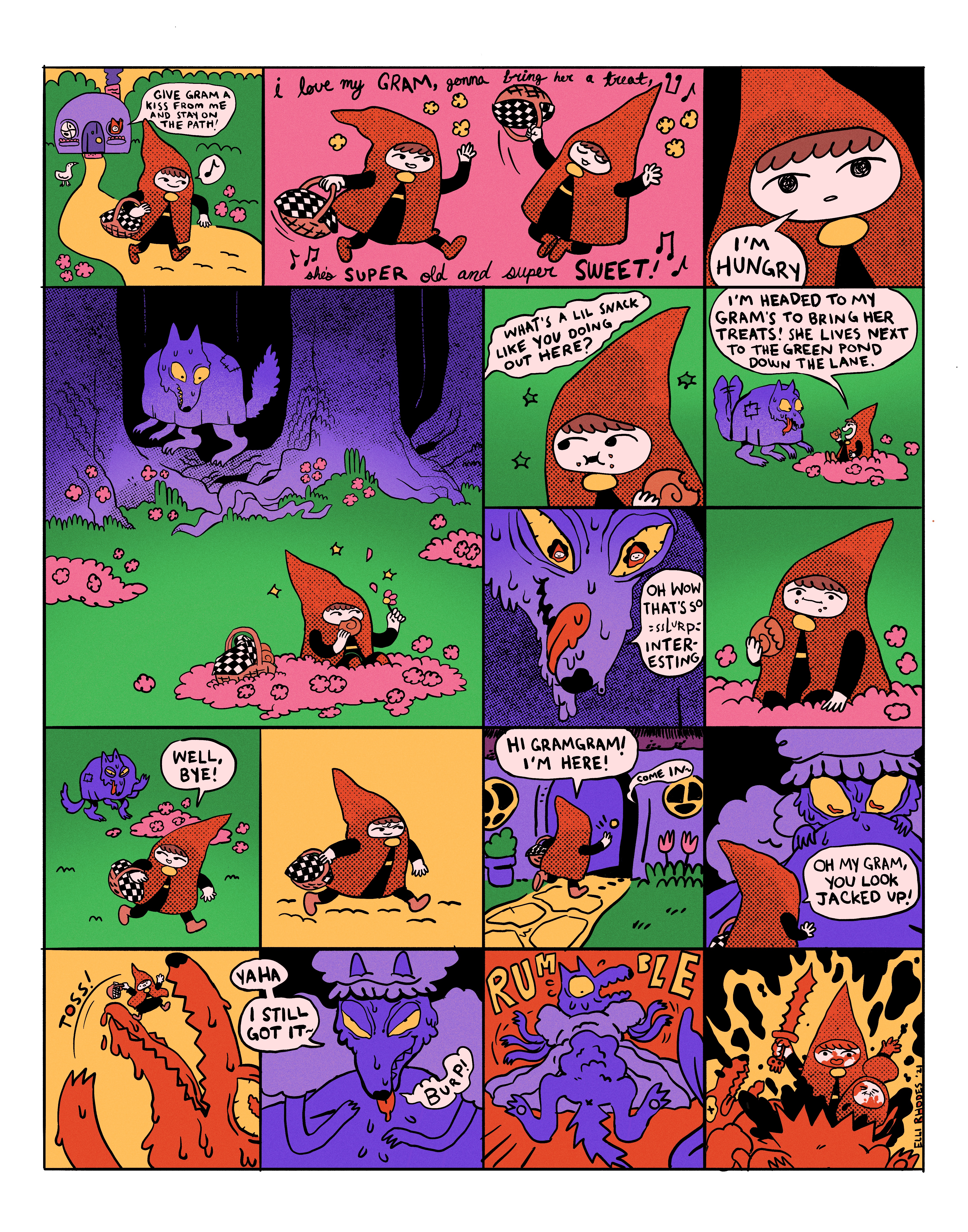 A one page comic condensing the Little Red Riding fable. Very silly by design. I’m particularly happy with the wolf design.